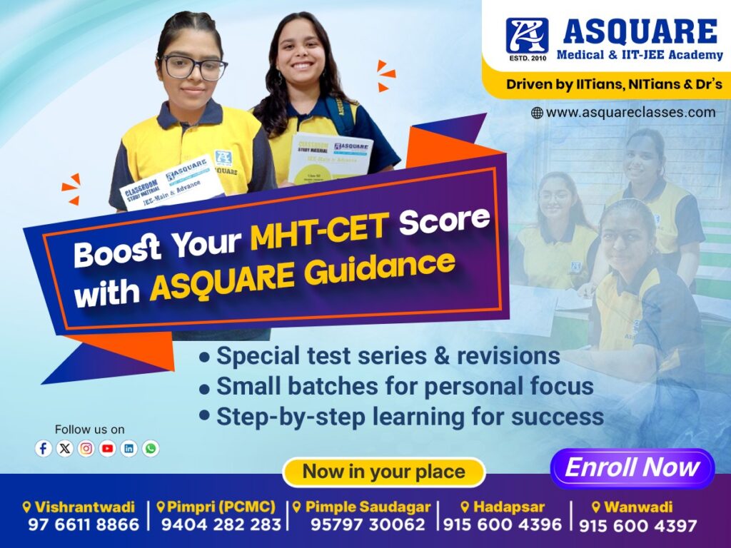 If you are looking for the best coaching for JEE, NEET, CET in Moshi PCMC, ASQUARE Pune is the right choice. Our proven teaching methods, expert faculty, and dedicated support system ensure that our students are well-equipped to achieve their academic goals. Join ASQUARE Pune today and take the first step toward securing a bright future!